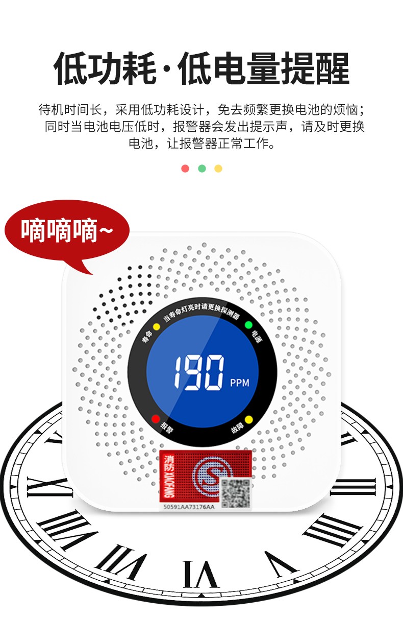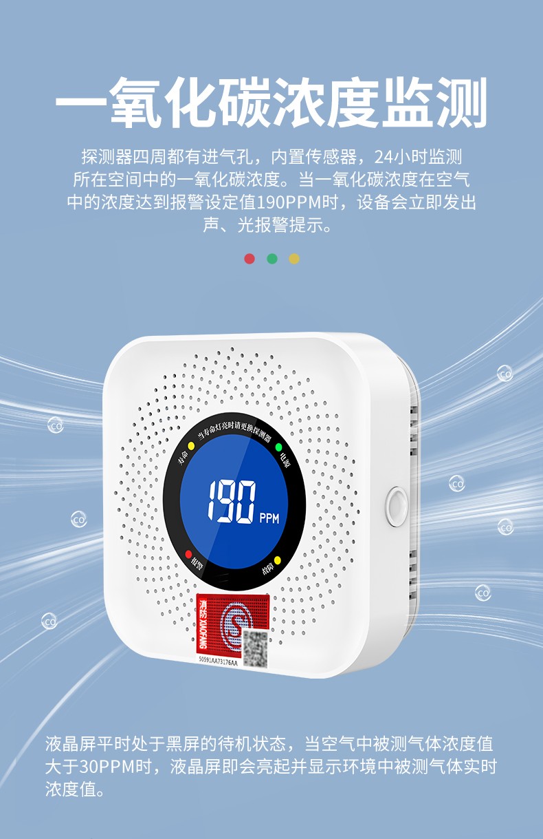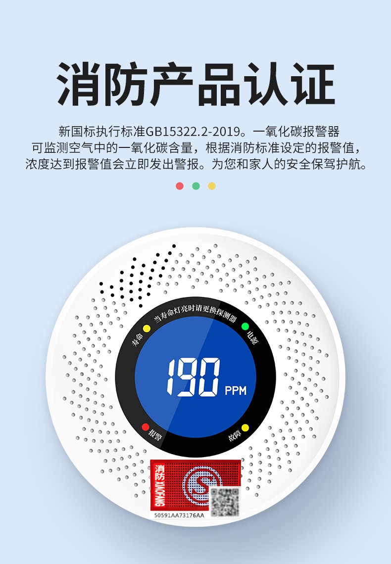 一氧化碳報警器(型號PA-007) 產(chǎn)品規(guī)格 功能特點 資料下載 一氧化碳報警器(型號PA-007)1.探測氣體:一氧化碳2.報警方式:高音報警、聲光報警3.材質(zhì):ABS阻燃材質(zhì)4.產(chǎn)品保險:1000萬承險適用場景:適用于廚房、浴室、起居室、火鍋包廂、飯?zhí)玫乳L時間空氣不流通的場所安裝一氧化碳報警探測器