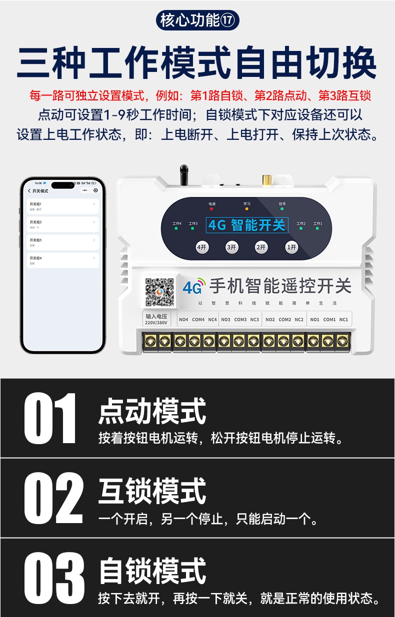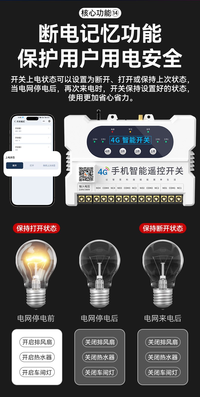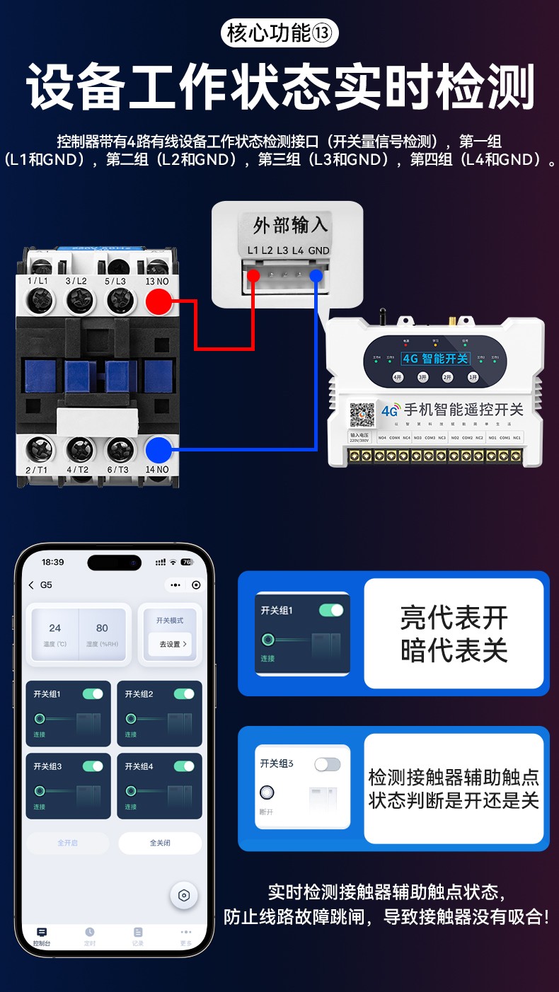 4G遠程控制開關(YS-A8) 產品規格 功能特點 資料下載 4G遠程控制開關(YS-A8)無需流量、無需插卡 、無需WIFI手機小程序控制定時開關:云端定時 、本地定時、 倒計時多人控制斷電提醒 +信息推送狀態檢測三種工作模式自動切換:點動模式 、互鎖模式 、自鎖模式工作電壓: 220v/380v (可選)應用場景:正反轉、水泵、啟動柜、變頻器 、魚塘增氧機、抽水泵、工業電機、燈具電器等